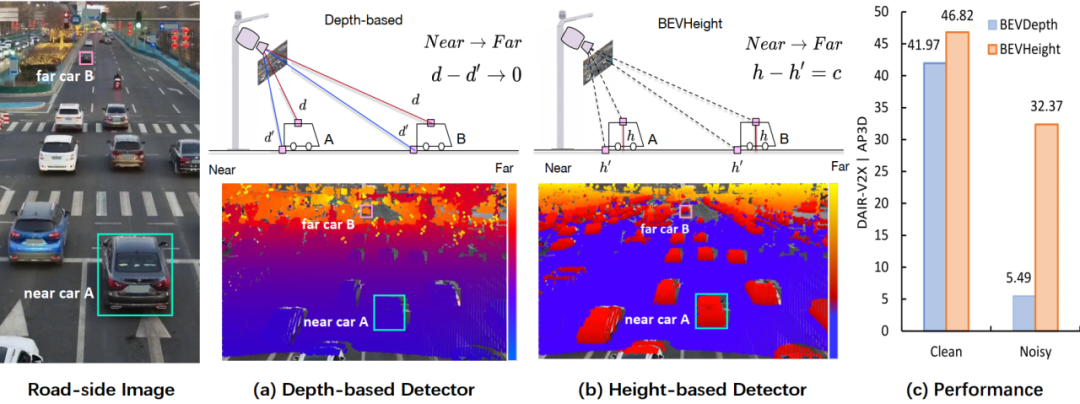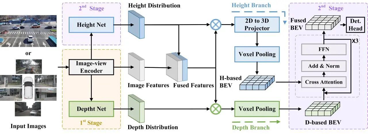 在技术亮点方面,针对传统深度估计在远距离易失效的问题,研究团队提出一种基于高度的空间建模方法,利用物体到地面的垂直距离进行三维空间建模,实现了与距离无关且对相机位姿变动鲁棒的空间表示。基于此,团队进一步设计了高度-深度双重建模分支网络,通过图像-鸟瞰视角两阶段融合框架生成抗干扰性强的融合鸟瞰视角特征图,实现了同时适配车端(低视角)与路侧(高视角)场景不受相机位姿变动、运动模糊等因素影响的鲁棒视觉感知。