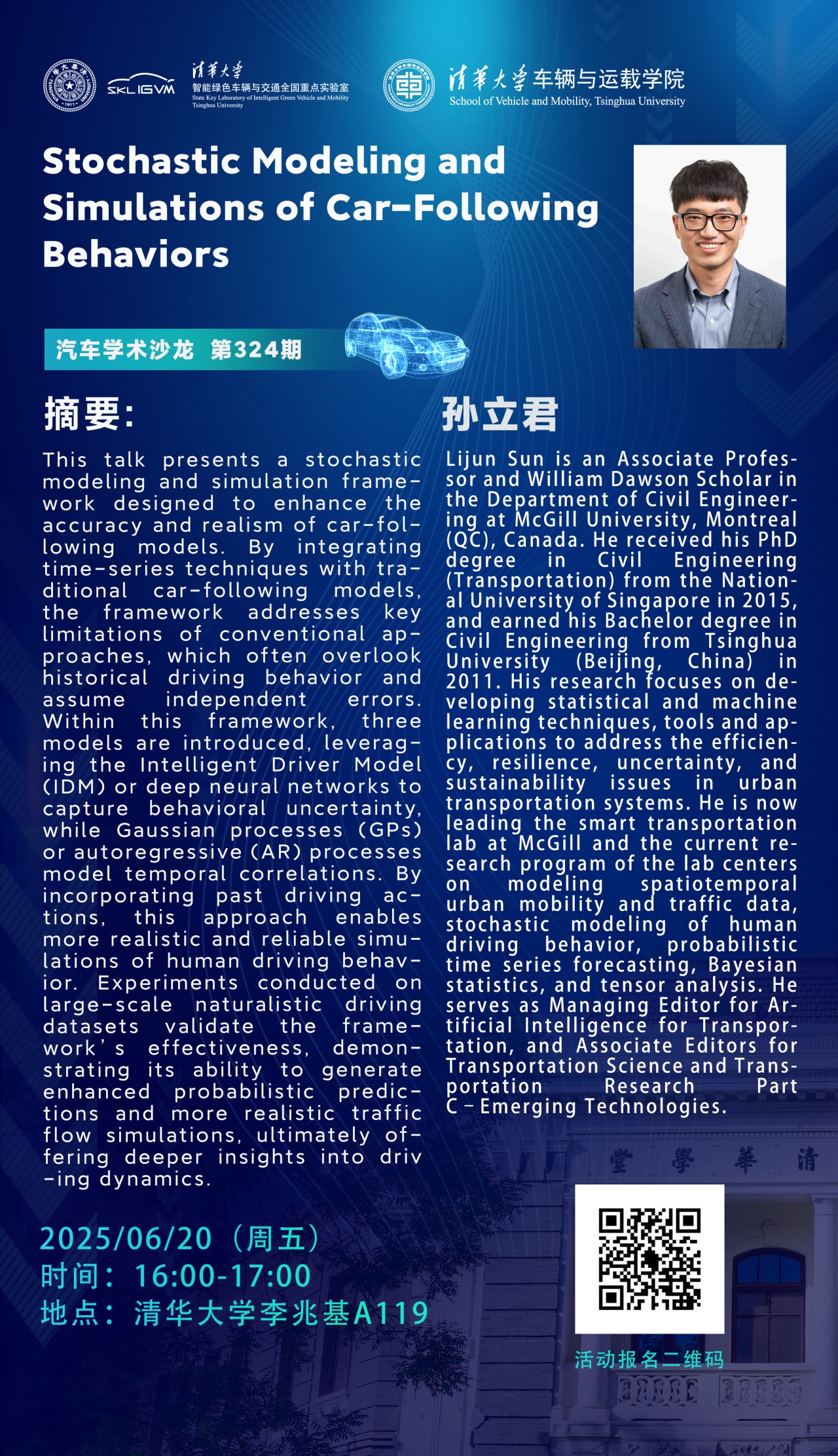 Lijun Sun is an Associate Professor and William Dawson Scholar in the Department of Civil Engineering at McGill University, Montreal (QC), Canada. He received his PhD degree in Civil Engineering (Transportation) from the National University of Singapore in 2015, and earned his Bachelor degree in Civil Engineering from Tsinghua University (Beijing, China) in 2011. His research focuses on developing statistical and machine learning techniques, tools and applications to address the efficiency, resilience, uncertainty, and sustainability issues in urban transportation systems. He is now leading the smart transportation lab at McGill and the current research program of the lab centers on modeling spatiotemporal urban mobility and traffic data, stochastic modeling of human driving behavior, probabilistic time series forecasting, Bayesian statistics, and tensor analysis. He serves as Managing Editor for Artificial Intelligence for Transportation, and Associate Editors for Transportation Science and Transportation Research Part C–Emerging Technologies.