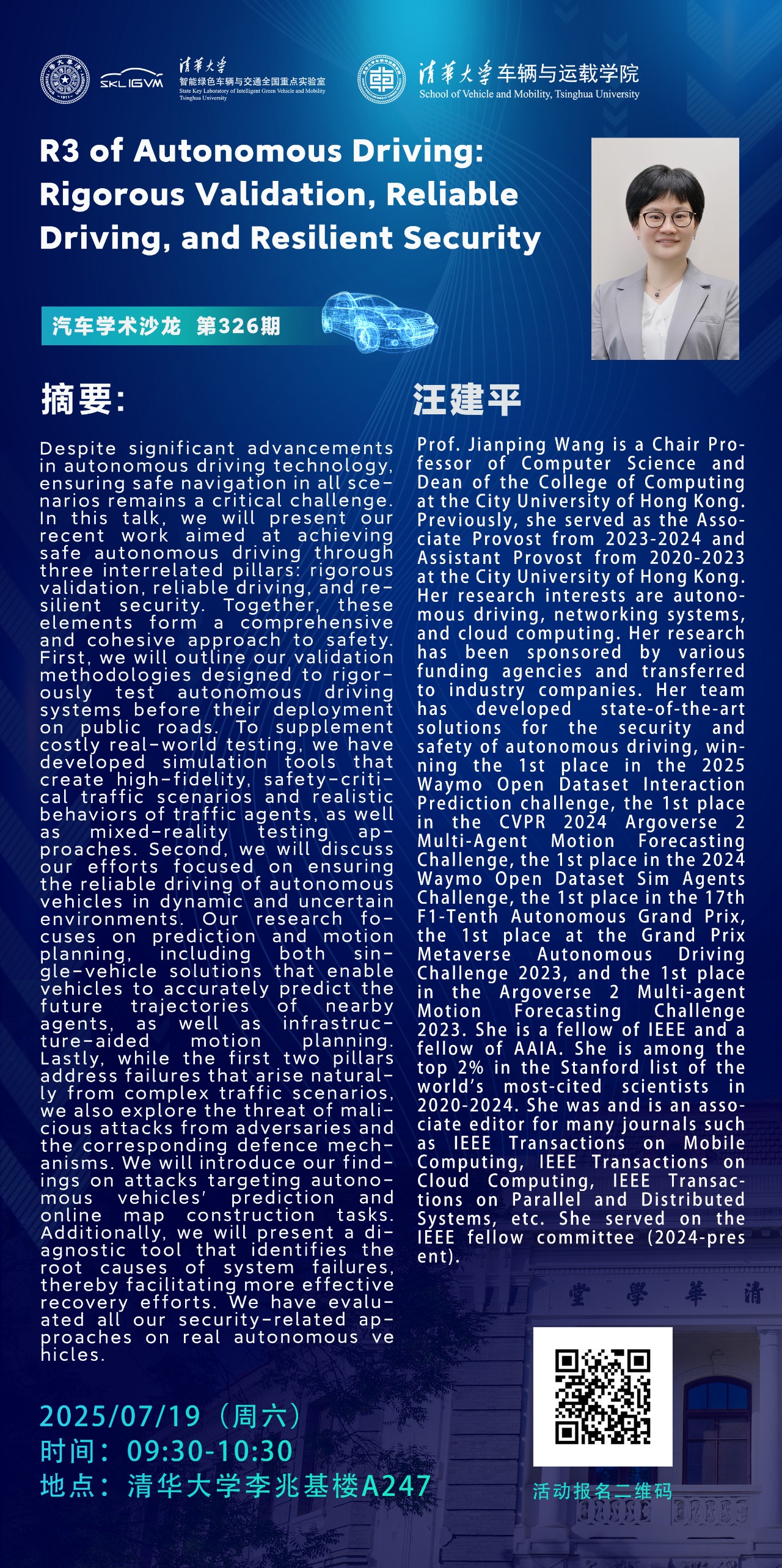 Prof. Jianping Wang is a Chair Professor of Computer Science and Dean of the College of Computing at the City University of Hong Kong. Previously, she served as the Associate Provost from 2023-2024 and Assistant Provost from 2020-2023 at the City University of Hong Kong. Her research interests are autonomous driving, networking systems, and cloud computing. Her research has been sponsored by various funding agencies and transferred to industry companies. Her team has developed state-of-the-art solutions for the security and safety of autonomous driving, winning the 1st place in the 2025 Waymo Open Dataset Interaction Prediction challenge, the 1st place in the CVPR 2024 Argoverse 2 Multi-Agent Motion Forecasting Challenge, the 1st place in the 2024 Waymo Open Dataset Sim Agents Challenge, the 1st place in the 17th F1-Tenth Autonomous Grand Prix, the 1st place at the Grand Prix Metaverse Autonomous Driving Challenge 2023, and the 1st place in the Argoverse 2 Multi-agent Motion Forecasting Challenge 2023. She is a fellow of IEEE and a fellow of AAIA. She is among the top 2% in the Stanford list of the world's most-cited scientists in 2020-2024. She was and is an associate editor for many journals such as IEEE Transactions on Mobile Computing, IEEE Transactions on Cloud Computing, IEEE Transactions on Parallel and Distributed Systems, etc. She served on the IEEE fellow committee (2024-present).