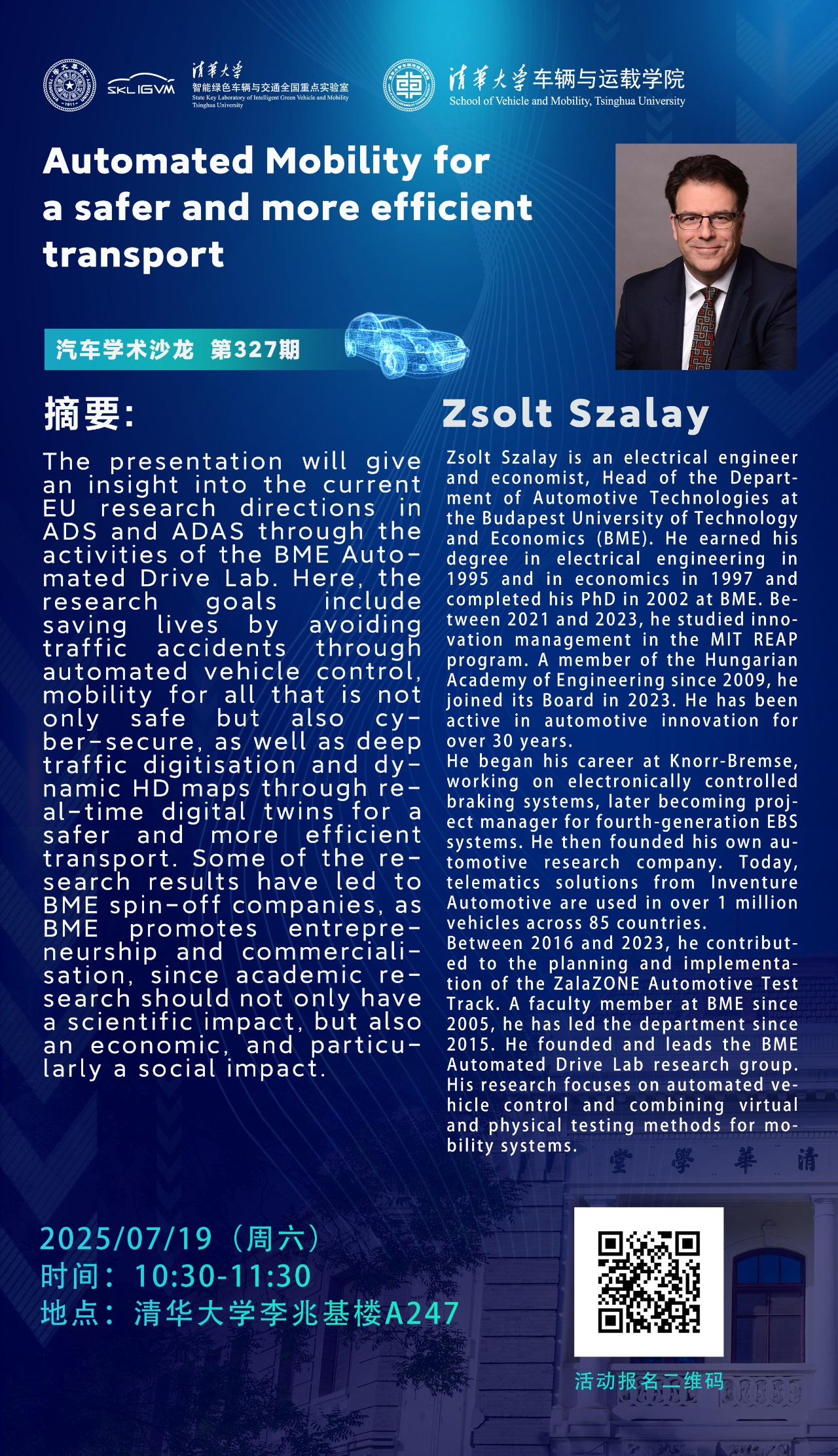 汽车学术沙龙326期、327期|香港城市大学计算机学院院长汪建平教授、布达佩斯技术与经济大学汽车系系主任Zsolt Szalay