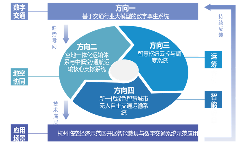 中心致力于开展前瞻性、系统性的未来交通技术研究和应用示范,重点围绕交通数字孪生、空地一体物流、智慧枢纽云控、无人自主交通四个方向开展协同创新,并在杭州临空经济示范区开展智能载具与数字交通示范应用。